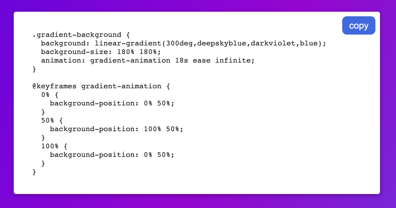 You can use https://animated-gradient-background-generator.netlify.app/ to generate the background code. It will give you a piece of code looking like this: